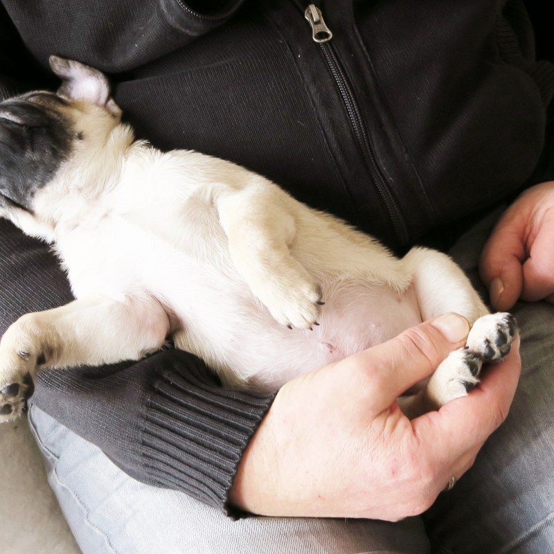 Aujourd’hui Marty a beaucoup dormi, je pense que la veille l’a épuisé. Il a notamment fait la sieste sur/avec mon papa, c’était trop mignon. Puis est venue l’heure pour mes parents de partir. Et là, que vois-je ??? Ma maman qui a mis Marty dans son sac et qui allait partir avec ahahah ! Il est tellement attachant ce petit bout de chien, que c’est impossible de ne pas craquer franchement. Je sais qu’on pourrait croire que je dis ça parce que c’est mon chien, mais il est vraiment extra. À 2mois et demi il obéit déjà à plusieurs ordres, ne pleure jamais pour dormir, est super sociable, n’a pas peur des bruits, dort tout seul et joue tout seul… La liste est longue !